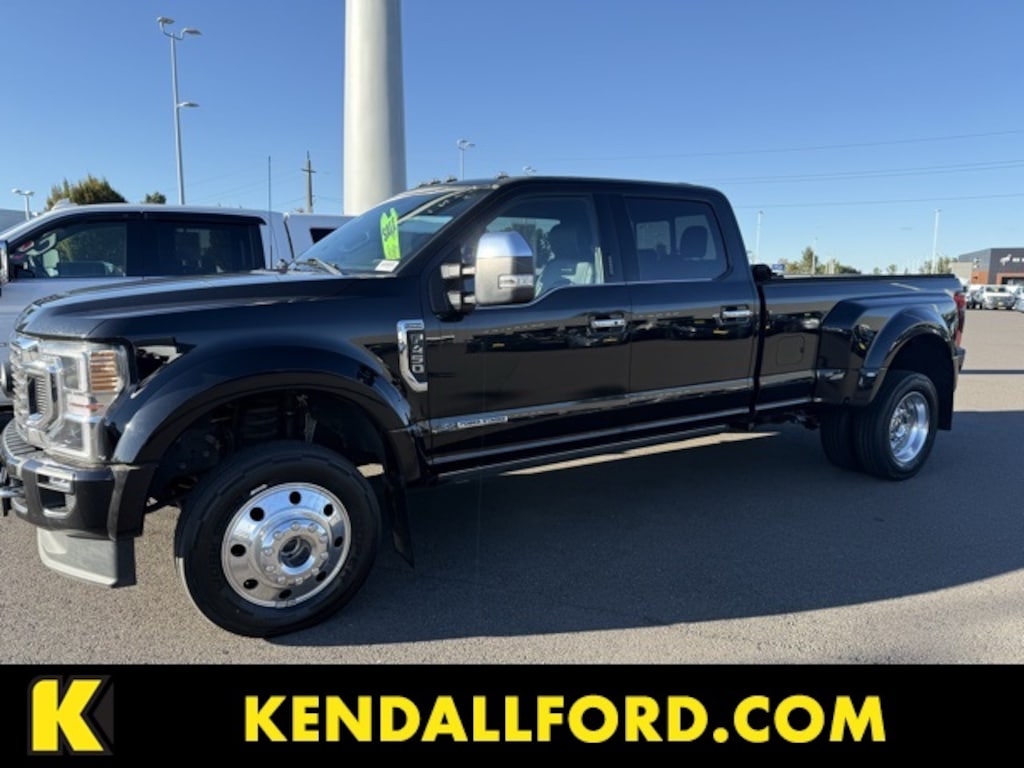 Black Metallic 2022 Ford F-450SD Platinum 4WD 10-Speed Automatic Power Stroke 6.7L V8 DI 32V OHV Turbodiesel CARFAX One-Owner. 4WD, 10 Speakers, 19.5" Forged Polished Aluminum Wheels, 397 Amp Alternator, 4-Wheel Disc Brakes, ABS brakes, Adjustable pedals, Air Conditioning, Alloy wheels, AM/FM radio: SiriusXM with 360L, Auto High-beam Headlights, Auto tilt-away steering wheel, Auto-dimming Rear-View mirror, Automatic temperature control, Brake assist, Bumpers: body-color, Camper Package, Compass, Customer-Placed Trailer Camera (Pre-Installed), Delay-off headlights, Driver door bin, Driver vanity mirror, Dual front impact airbags, Dual front side impact airbags, Dual rear wheels, Electronic Stability Control, Emergency communication system: SYNC 4 911 Assist, Engine Block Heater, Exterior Parking Camera Rear, Flow-Through Console, Front anti-roll bar, Front Bucket Seats, Front Center Armrest, Front dual zone A/C, Front fog lights, Front License Plate Bracket, Front reading lights, Front Wheel Well Liners (Pre-Installed), Fully automatic headlights, Garage door transmitter, GVWR: 14,000 lb Payload Package, Heated door mirrors, Heated front seats, Heated rear seats, Heated steering wheel, Illuminated entry, Leather steering wheel, Limited Slip w/4.30 Axle Ratio, Memory seat, Navigation system: Connected Navigation, Order Code 773A, Outside temperature display, Overhead airbag, Overhead console, Panic alarm, Passenger door bin, Passenger vanity mirror, Pedal memory, Power door mirrors, Power driver seat, Power Locks, Power passenger seat, Power steering, Power windows, Radio data system, Radio: B&O Sound System by Bang & Olufsen, Rain sensing wipers, Rapid-Heat Supplemental Cab Heater, Rear anti-roll bar, Rear Parking Sensors, Rear reading lights, Rear seat center armrest, Rear Splash Guards/Mud Flaps (Pre-Installed), Rear step bumper, Rear window defroster, Remote keyless entry, Remote Start System, Security system, SiriusXM Radio w/360L, Soft Folding Tonneau Pickup Box Cover (Pre-Installed), Speed control, Speed-sensing steering, Split folding rear seat, Steering wheel memory, Steering wheel mounted A/C controls, Steering wheel mounted audio controls, SYNC 4 w/Enhanced Voice Recognition, Tachometer, Telescoping steering wheel, Tilt steering wheel, Tough Bed Spray-In Bedliner, Traction control, Trip computer, Turn signal indicator mirrors, Twin Panel Power Moonroof, Unique Platinum Leather 40/Console/40 Seats, Upfitter Switches (6), Variably intermittent wipers, Ventilated front seats, 4WD.