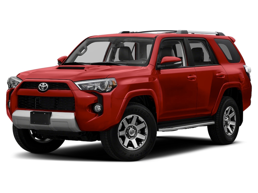 Barcelona Red Metallic 2019 Toyota 4Runner TRD Off-Road 4WD 5-Speed Automatic with Overdrive 4.0L V6 SMPI DOHC Clean CARFAX. 4WD, Graphite Cloth, 3.727 Axle Ratio, 4-Wheel Disc Brakes, 8 Speakers, ABS brakes, Air Conditioning, All-Weather Floor Liners/Cargo Tray Package, Alloy wheels, AM/FM radio: SiriusXM, Anti-whiplash front head restraints, Black Roof Rails, Brake assist, Bumpers: body-color, CD player, Compass, Driver door bin, Driver vanity mirror, Dual front impact airbags, Dual front side impact airbags, Electronic Stability Control, Emergency communication system: Safety Connect, Exterior Parking Camera Rear, Fabric Seat Trim, Front anti-roll bar, Front Bucket Seats, Front Center Armrest, Front fog lights, Front reading lights, Front wheel independent suspension, Heated door mirrors, Illuminated entry, Knee airbag, Leather Shift Knob, Low tire pressure warning, Occupant sensing airbag, Off Road Package, Outside temperature display, Overhead airbag, Overhead console, Panic alarm, Passenger door bin, Passenger vanity mirror, Power door mirrors, Power driver seat, Power steering, Power windows, Radio: Entune Audio Plus, Radio: Entune Premium Audio with Navigation, Rear anti-roll bar, Rear seat center armrest, Rear window defroster, Rear window wiper, Remote keyless entry, Roof rack: rails only, Security system, Speed control, Speed-sensing steering, Split folding rear seat, Spoiler, Steering wheel mounted audio controls, Tachometer, Telescoping steering wheel, Tilt steering wheel, Traction control, Trip computer, Variably intermittent wipers, Wheels: 17" x 7.5" 7-Spoke Unique Off-Road Alloy, 4WD, Graphite Cloth.